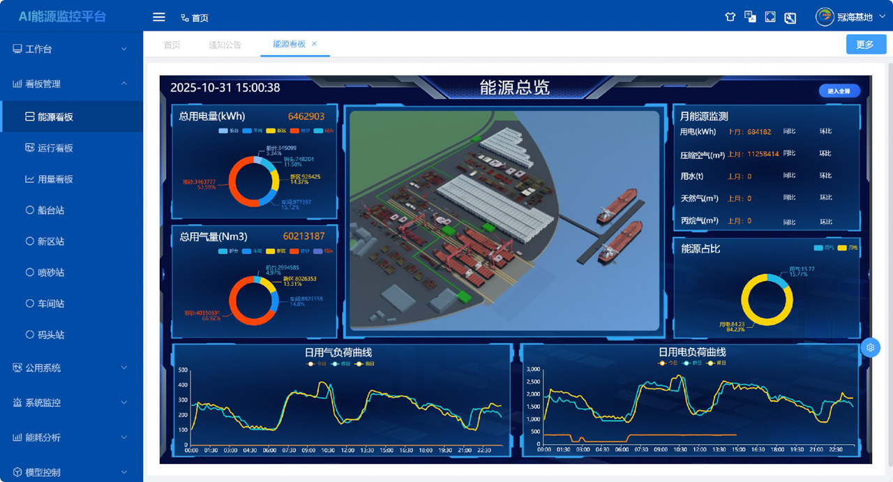 走进福建船政冠海基地集控中心,实时用电量、空压机压力、空压机温度等参数在AI综合能源管理平台大屏上一目了然,空压系统整体运行效率可实时掌握。